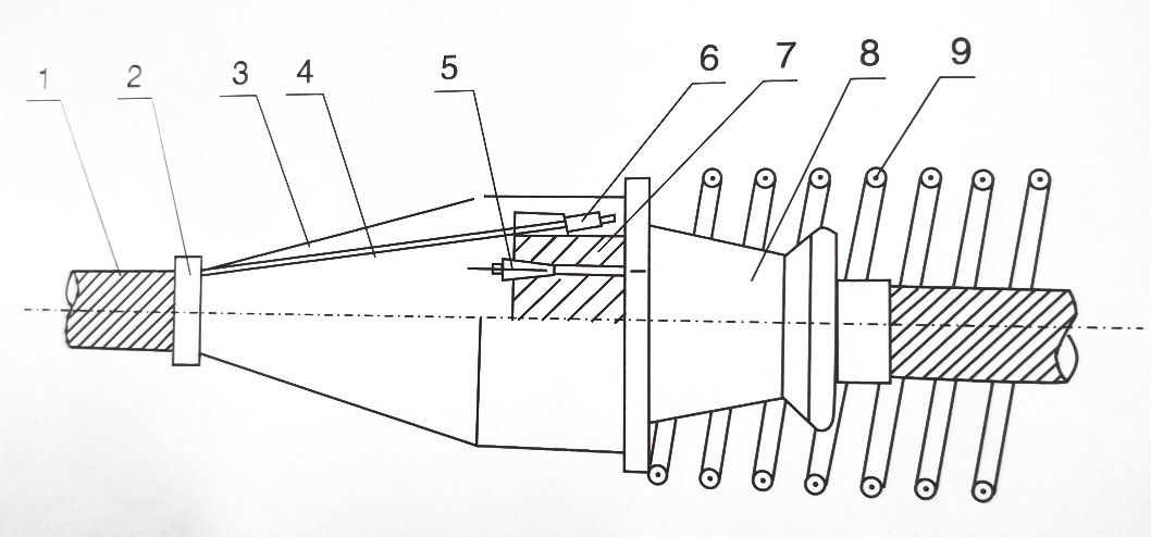 1、波紋管 2、緊篩環(huán) 3、罩殼 4、預(yù)應(yīng)力筋 5、夾片 6、擠壓錨具 7、連接器 8、喇叭管 9、螺旋筋